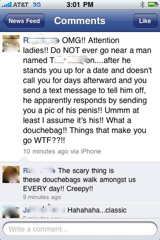 Frist of all, props to the guys “J”, “J” and “E” for handling this whiny broad with biting humor, and to the original penis pic sender for offending her sensibilities. I like the last suggestion from “J” that she should return fire with a pic of her vagina. For some reason I cannot fathom, I doubt she’ll consider that option.